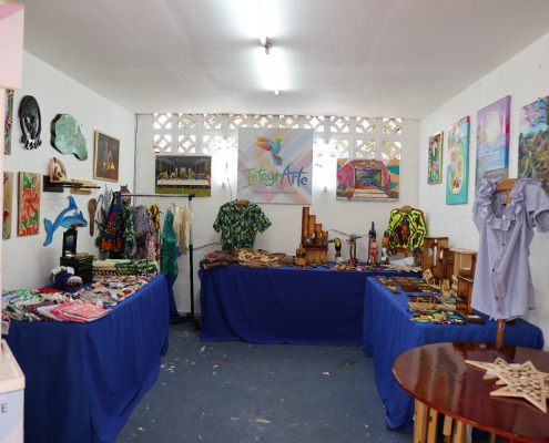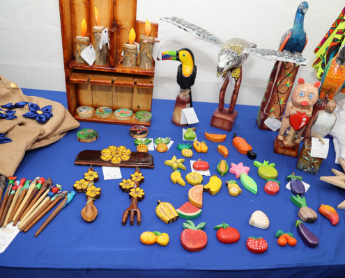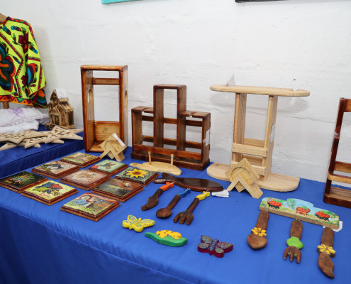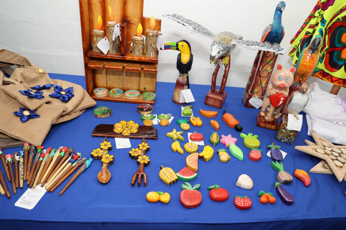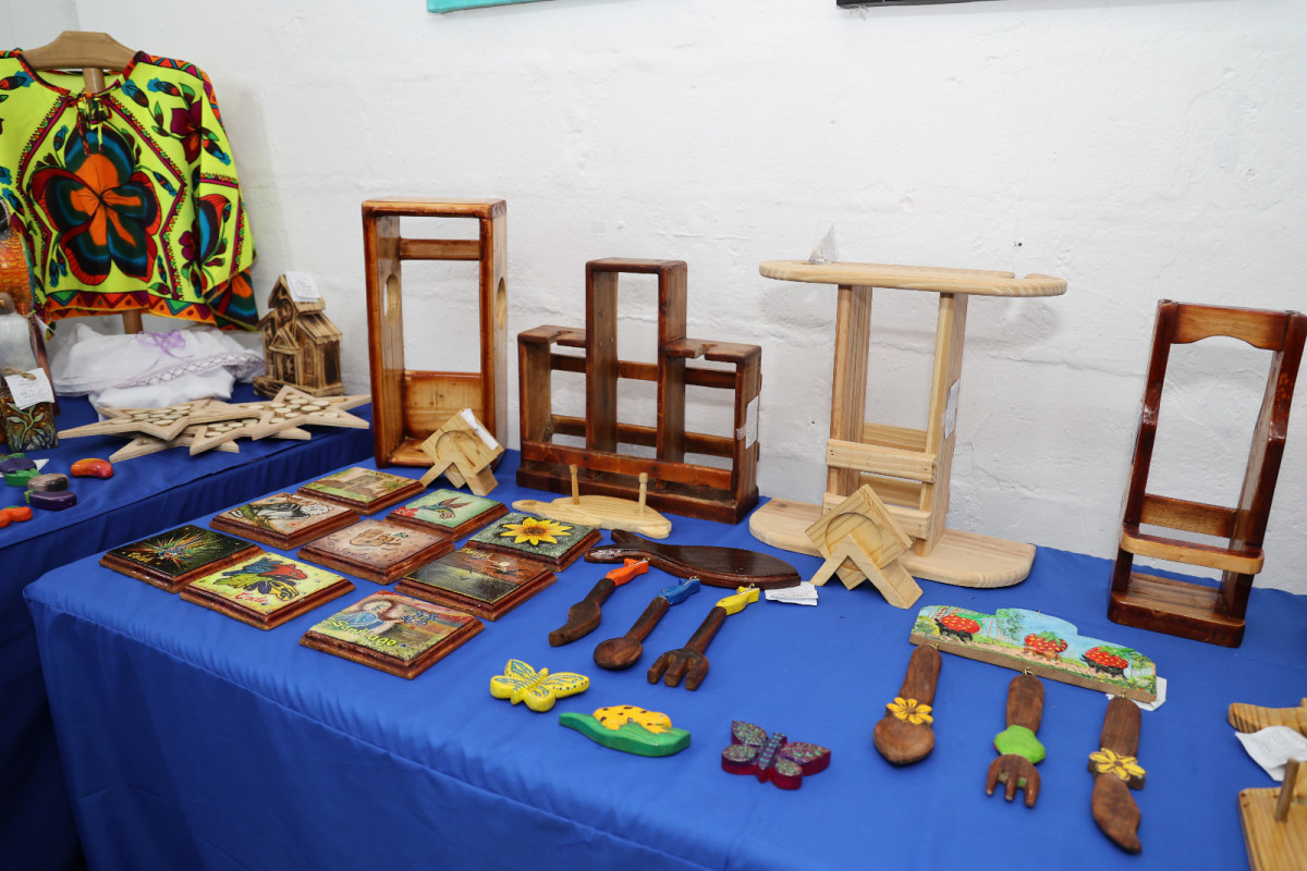 Están a la venta artesanías de todo tipo, muebles como mesa, vineras, envases para macetas, accesorios de bisutería, carteras, blusas, collares y brazaletes de fieltro, cuadros tallados y pinturas, entre otros artículos.