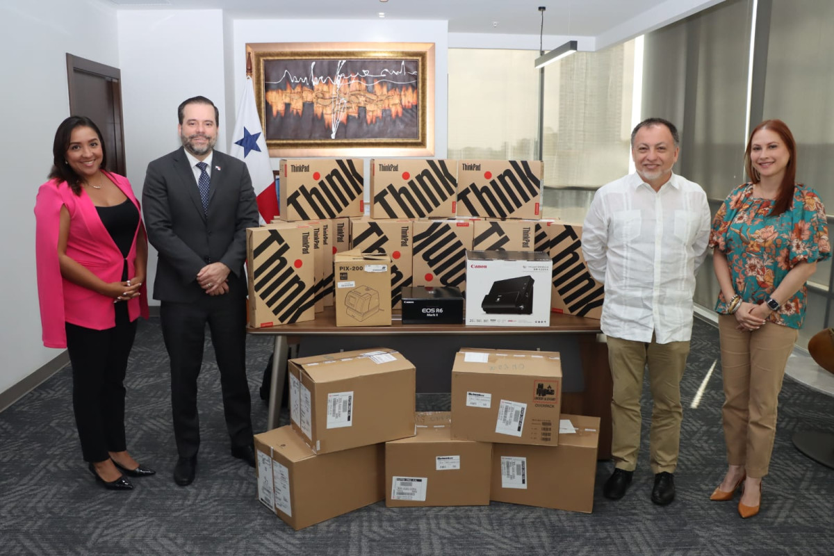 Panamá, 27 de marzo de 2025.- Una importante donación de equipos tecnológicos, recibió Juan Francisco Borrell, viceministro de Gobierno, por parte de José Egas, alto Comisionado de las Naciones Unidas para los Refugiados (ACNUR). Se trata de laptops, cámaras, reloj de marcación e impresoras.