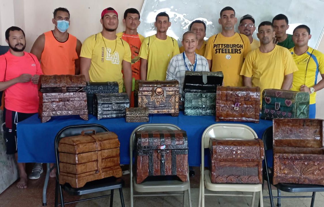 Los Santos, 20 de febrero de 2023. – Con materiales reciclados como cartón, papel manila y papel toalla, entre otros, 19 privados de libertad del centro penitenciario Las Tablas, aprenden a confeccionar cofres aplicando los conocimientos adquiridos en el Curso de Artesanía Manual, que dicta el Instituto Nacional de Formación Profesional y Capacitación para el Desarrollo Humano (Inadeh).