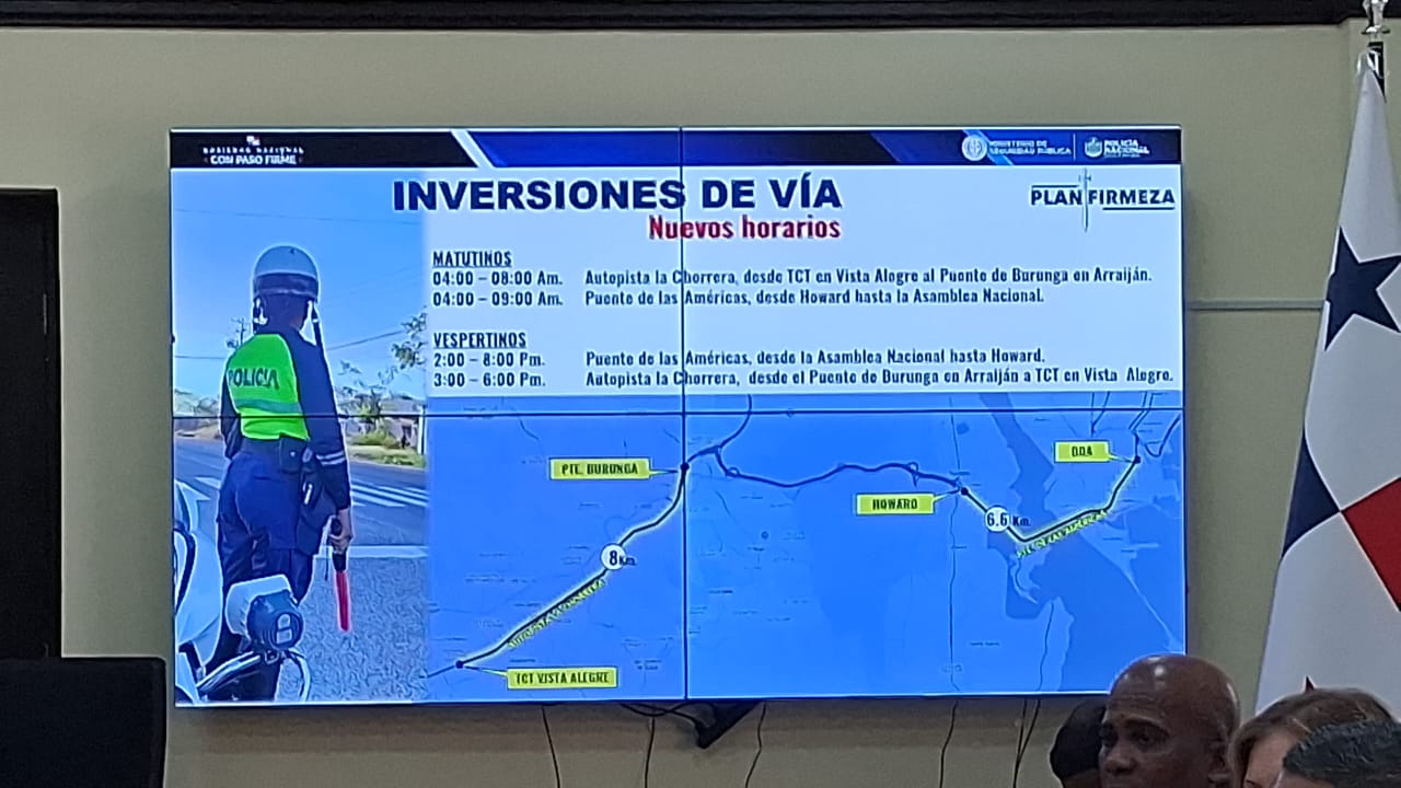 El director nacional de Operaciones de Tránsito, Kevin Quiel, detalló que en horario matutino la inversión de carriles se aplicará de 4:00 a.m. a 8:00 a.m. en la autopista La Chorrera, desde la TCT en Vista Alegre hasta el puente de Burunga, en Arraiján. Asimismo, de 4:00 a.m. a 9:00 a.m. en el puente de Las Américas, desde el sector de Howard hasta la Asamblea Nacional.