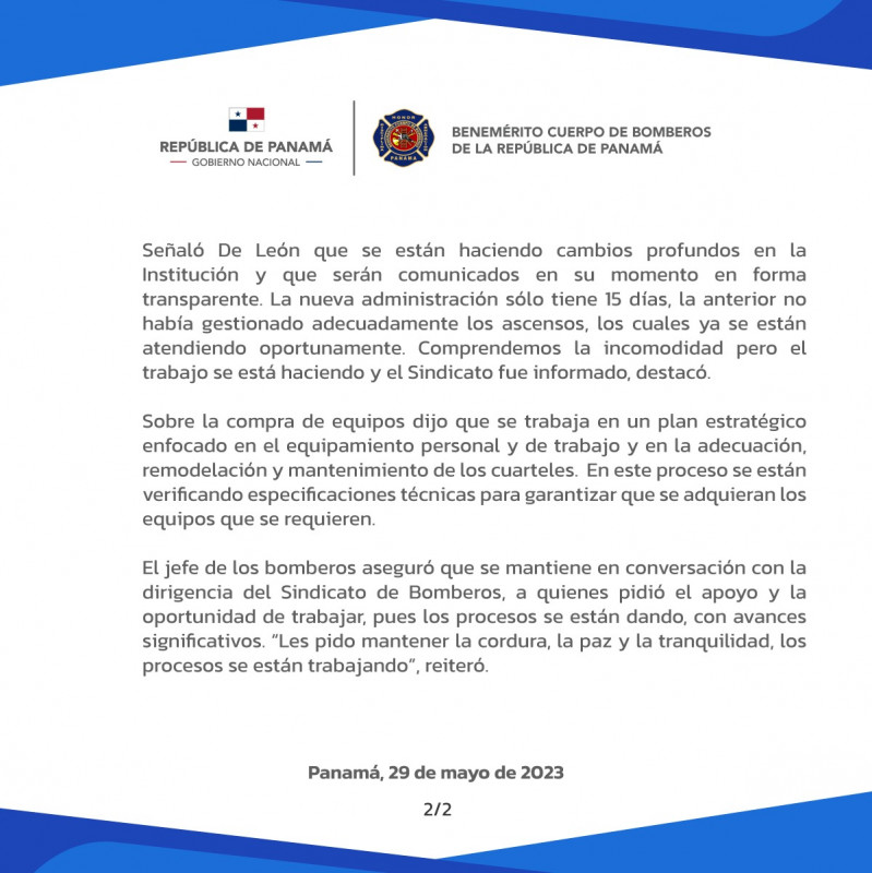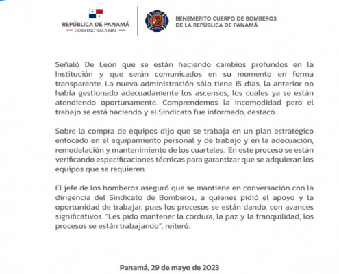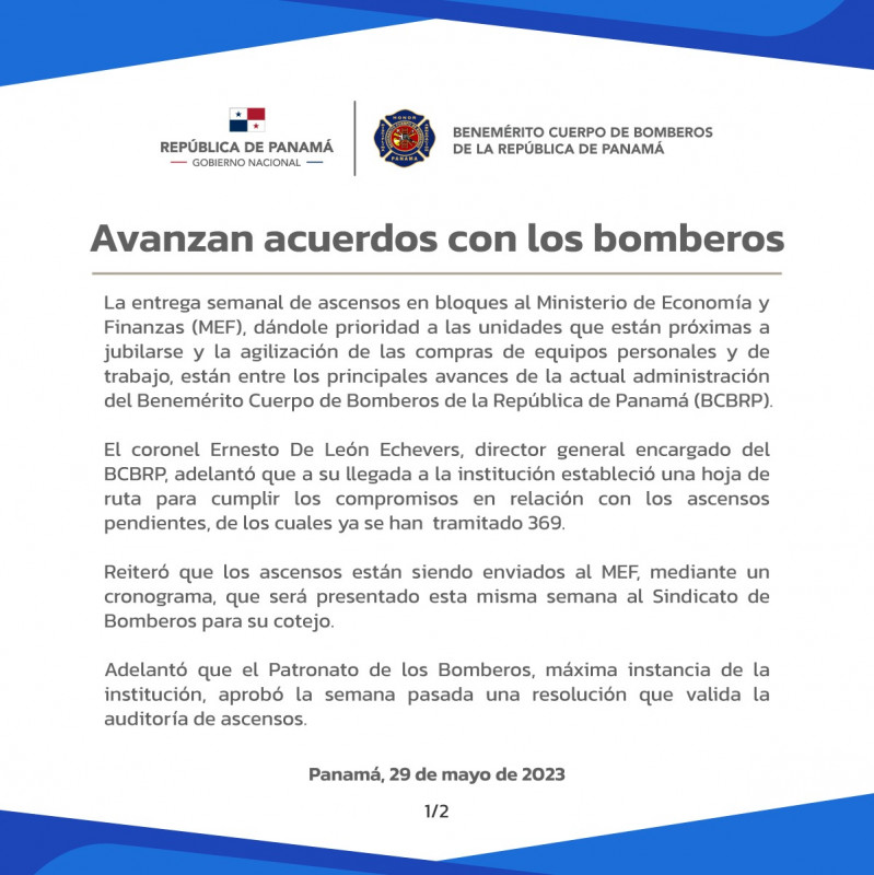 Panamá, 29 de mayo de 2023. La entrega semanal de ascensos en bloques al Ministerio de Economía y Finanzas (MEF), dándole prioridad a las unidades que están próximas a jubilarse y la agilización de las compras de equipos personales y de trabajo, están entre los principales avances de la actual administración del Benemérito Cuerpo de Bomberos de la República de Panamá (BCBRP).