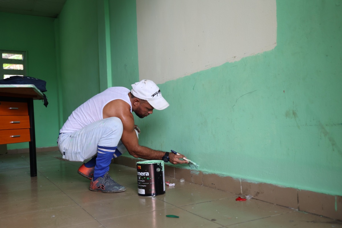 Panamá, 7 de enero de 2025.- «Estamos enfocados en aportar a la educación panameña; estos trabajos de mantenimiento y limpieza en escuelas, lo hacemos con amor», sostuvo el privado de libertad Abraham Escobar de El Renacer, mientras pintaba un salón de informática en el Centro Educativo Koskuna, Veracruz.