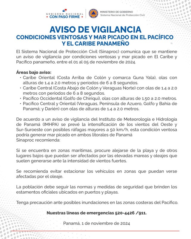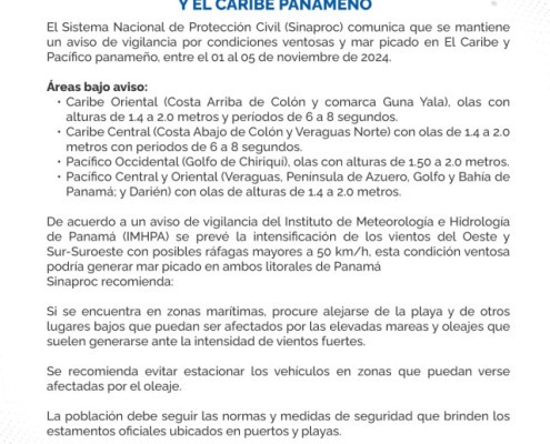 Panamá, 1 de noviembre de 2024. El Sistema Nacional de Protección Civil (Sinaproc) comunica que se mantiene un aviso de vigilancia por condiciones ventosas y mar picado en El Caribe y Pacífico panameño, entre el 01 al 05 de noviembre de 2024.