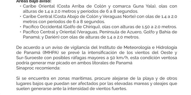 • De acuerdo a un aviso de vigilancia del Instituto de Meteorología e Hidrología de Panamá (IMHPA) se prevé la intensificación de los vientos del Oeste y Sur-Suroeste con posibles ráfagas mayores a 50 km/h, esta condición ventosa podría generar mar picado en ambos litorales de Panamá