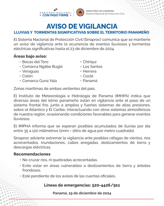 Panamá, 19 de diciembre 2024.- El Sistema Nacional de Protección Civil (Sinaproc) comunica que se mantiene un aviso de vigilancia ante la ocurrencia de eventos lluviosos y tormentas eléctricas significativas hasta el 23 de diciembre de 2024.