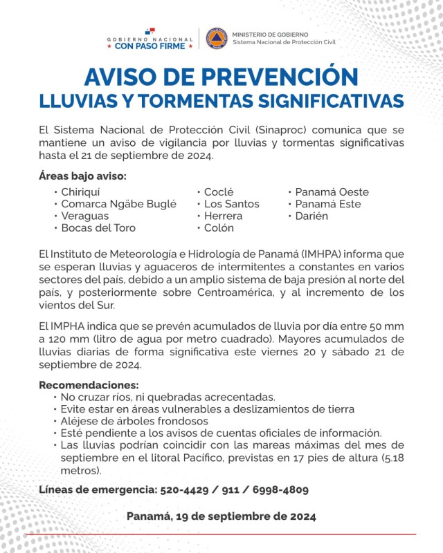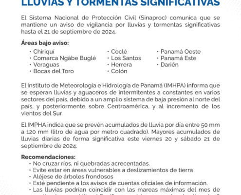 Panamá, 19 de septiembre de 2024. El Sistema Nacional de Protección Civil (Sinaproc) comunica que se mantiene un aviso de vigilancia por lluvias y tormentas significativas hasta el 21 de septiembre de 2024.