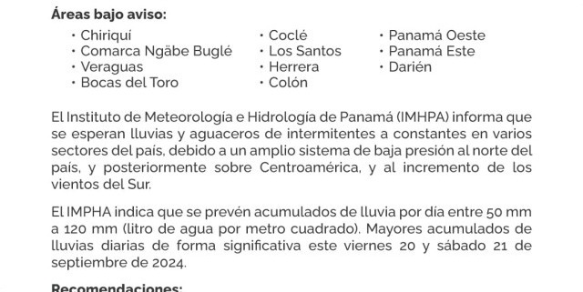El Instituto de Meteorología e Hidrología de Panamá (IMHPA) informa que se esperan lluvias y aguaceros de intermitentes a constantes en varios sectores del país, debido a un amplio sistema de baja presión al norte del país, y posteriormente sobre Centroamérica, y al incremento de los vientos del Sur.
