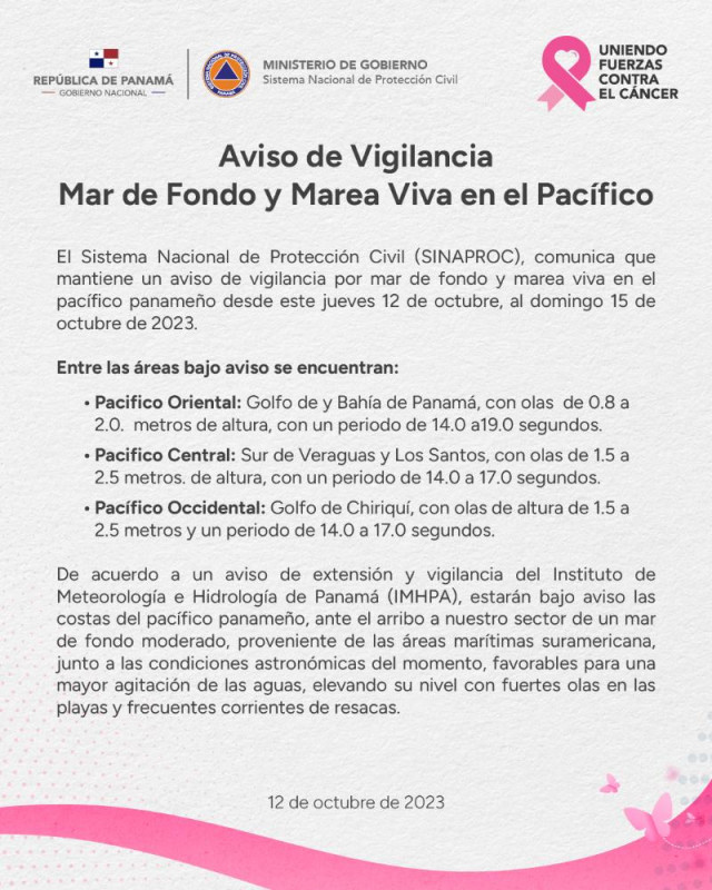 El Sistema Nacional de Protección Civil (SINAPROC), comunica que mantiene un aviso de vigilancia por mar de fondo y marea viva en el pacífico panameño desde este jueves 12 de octubre, al domingo 15 de octubre de 2023.