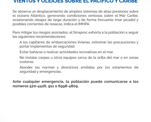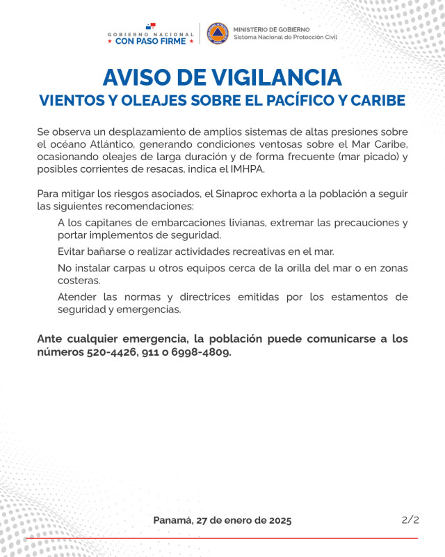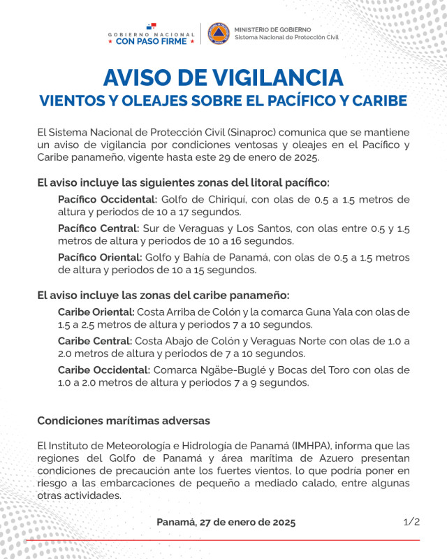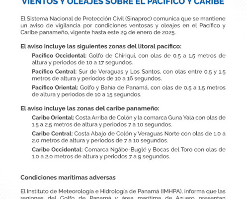 Panamá, 27 de enero de 2025.- El Sistema Nacional de Protección Civil (Sinaproc) comunica que se mantiene un aviso de vigilancia por condiciones ventosas y oleajes en el Pacífico y Caribe panameño, vigente hasta este 29 de enero de 2025.