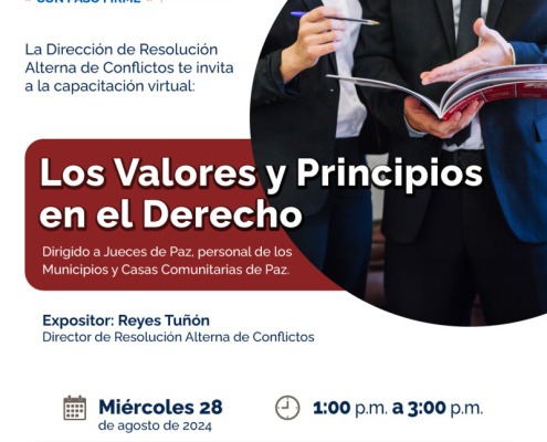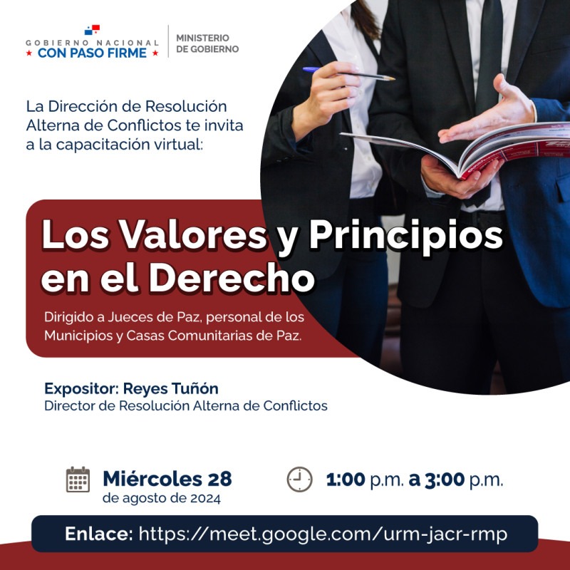El próximo 28 de agosto de 2024, el Licdo. Reyes Tuñón, director de la Dirección de Resolución Alterna de Conflictos, ofrecerá una importante charla sobre «Los Valores y Principios en el Derecho». Esta sesión, dirigida a jueces de paz, personal de los municipios y casas comunitarias de paz, se llevará a cabo de manera virtual a través de la plataforma Google Meet, de 1:00 p.m. a 3:00 p.m.