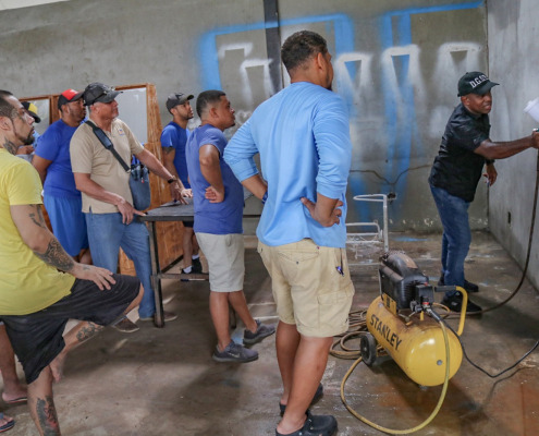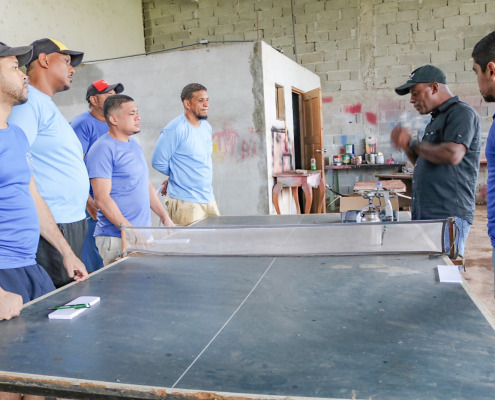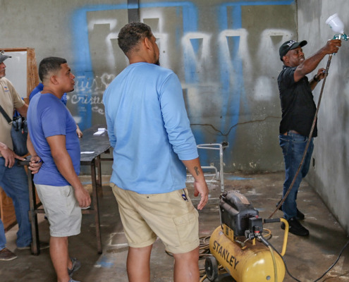 Panamá, 5 de septiembre de 2023. – Una capacitación sobre pintura con compresor recibieron los privados de libertad que asisten al taller de ebanistería Integrarte en el centro penitenciario La Joya, con el fin de mejorar las habilidades de las personas privadas de libertad en esta área técnica así como perfeccionar la calidad de los productos que ofrece el proyecto al público.
