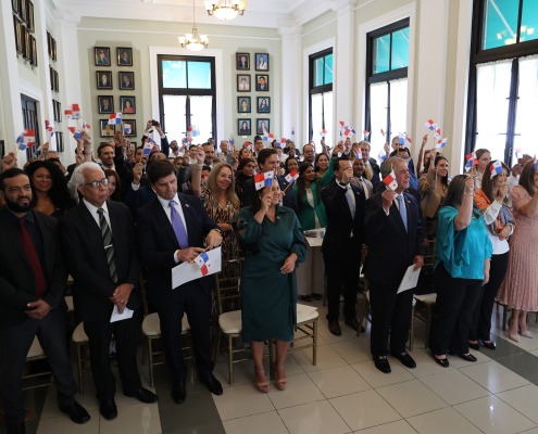 El viceministro de Gobierno, Juan Francisco Borrell Cal, dirige el juramento a la bandera panameña de los 46 ciudadanos que participan en el primer acto protocolar de extranjeros que obtienen la nacionalidad panameña durante este quinquenio.