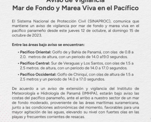 El Sistema Nacional de Protección Civil (SINAPROC), comunica que mantiene un aviso de vigilancia por mar de fondo y marea viva en el pacífico panameño desde este jueves 12 de octubre, al domingo 15 de octubre de 2023.