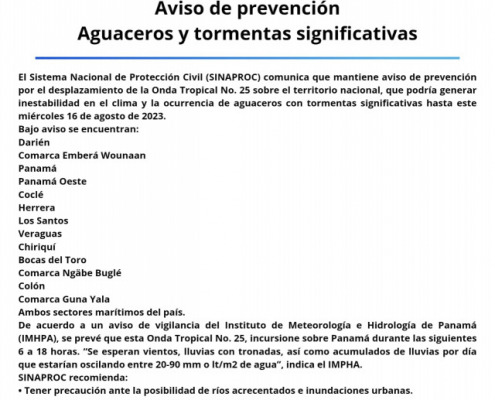 Panamá 14 de agosto del 2023. El Sistema Nacional de Protección Civil (SINAPROC) comunica que mantiene aviso de prevención por el desplazamiento de la Onda Tropical No. 25 sobre el territorio nacional, que podría generar inestabilidad en…