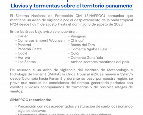 Panamá, 11 de agosto de 2023. El Sistema Nacional de Protección Civil (SINAPROC) comunica que mantiene un aviso de vigilancia por el desplazamiento de la onda tropical N°24 desde hoy 11 de agosto, hasta el domingo 13 de agosto de 2023.