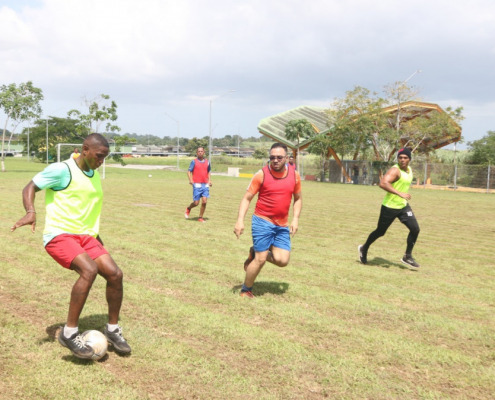 Panamá, 10 de agosto de 2023. – Un partido amistoso de fútbol entre un equipo conformado por privados de libertad que participan en los programas de resocialización “Extramuro” de los centros El Renacer y Tinajitas y el onceno de Merca…