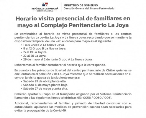 Veraguas, 26 de mayo de 2023. – El lunes 29 y martes 30 de mayo se realizará la visita familiar en el centro penitenciario de Santiago, con el objetivo de reforzar el vínculo familiar de la población privada de libertad, importante para…