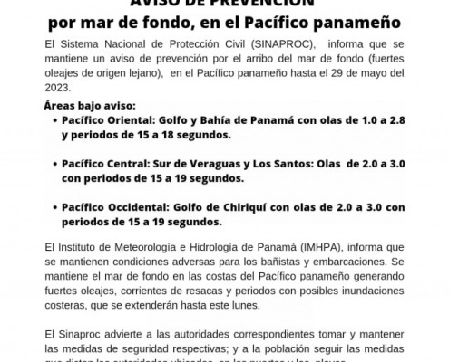 Panamá, 27 de mayo del 2023. El Sistema Nacional de Protección Civil (SINAPROC), informa que se mantiene un aviso de prevención por el arribo del mar de fondo (fuertes oleajes de origen lejano), en el Pacífico panameño hasta el 29 de mayo…
