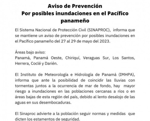 Panamá, 27 de mayo del 2023. El Sistema Nacional de Protección Civil (SINAPROC), informa que se mantiene un aviso de prevención por posibles inundaciones en el Pacífico panameño del 27 al 29 de mayo del 2023.