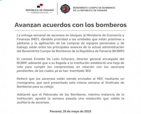 Panamá, 30 de mayo de 2023. Con el fin de acercar las posiciones que se mantenían a la fecha, la actual administración del Benemérito Cuerpo de Bomberos de la República de Panamá (BCBRP) y la dirigencia del Sindicato de Bomberos sostuvieron…