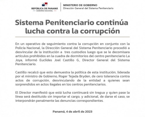 Panamá, 4 de abril de 2023. – En un operativo de seguimiento contra la corrupción en conjunto con la Policía Nacional, la Dirección General del Sistema Penitenciario procedió a desvincular de la institución a tres custodios luego que…