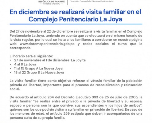 Del 27 de noviembre al 22 de diciembre se realizará la visita familiar en el Complejo Penitenciario La Joya, teniendo en cuenta que se efectuará en el mismo horario de la vista regular, por lo cual se insta a los familiares a corroborar en…