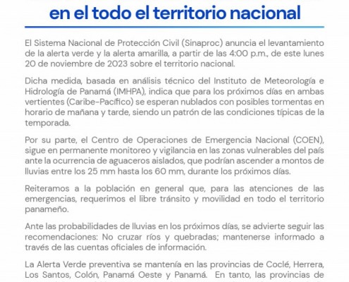 Panamá, 20 de noviembre de 2023. El Sistema Nacional de Protección Civil (Sinaproc) anuncia el levantamiento de la alerta verde y la alerta amarilla, a partir de las 4:00 p.m., de este lunes 20 de noviembre de 2023 sobre el territorio nacional.