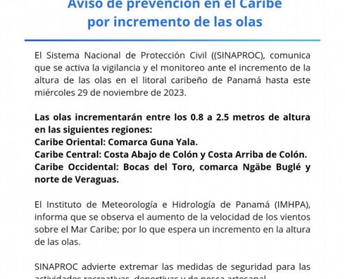 Panamá, 26 de noviembre de 2023. El Sistema Nacional de Protección Civil ((SINAPROC), comunica que se activa la vigilancia y el monitoreo ante el incremento de la altura de las olas en el litoral caribeño de Panamá hasta este miércoles…