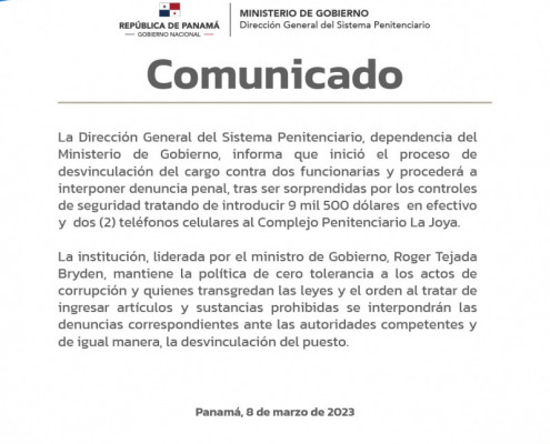 Panamá, 8 de marzo de 2023. – La Dirección General del Sistema Penitenciario, dependencia del Ministerio de Gobierno, informa que inició el proceso de desvinculación del cargo contra dos funcionarias y procederá a interponer denuncia…