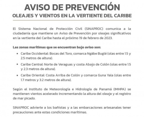 Panamá, 17 de febrero de 2023. El Sistema Nacional de Protección Civil (SINAPROC) comunica a la ciudadanía que mantiene un Aviso de Prevención por oleajes significativos en la vertiente del Caribe hasta el próximo 19 de febrero de 2023.
