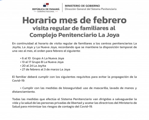 En continuidad al horario de visita regular de familiares a los centros penitenciarios La Joyita, La Joya y La Nueva Joya, recordando que se mantiene la disposición temporal de una vez al mes, el orden para febrero el siguiente: