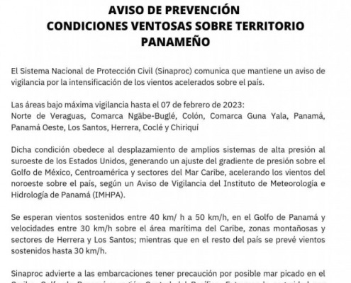 Panamá, 05 de febrero de 2023. El Sistema Nacional de Protección Civil (Sinaproc) comunica que mantiene un aviso de vigilancia por la intensificación de los vientos acelerados sobre el país.
