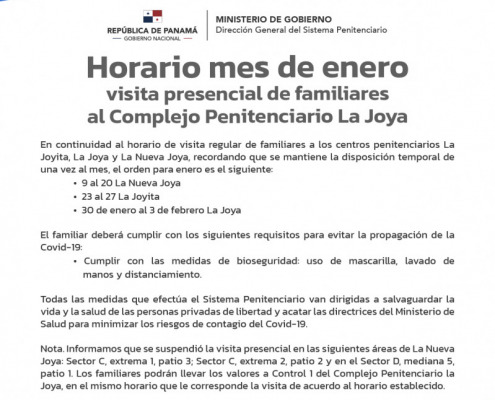En continuidad al horario de visita regular de familiares a los centros penitenciarios La Joyita, La Joya y La Nueva Joya, recordando que se mantiene la disposición temporal de una vez al mes, el orden para enero es el siguiente: