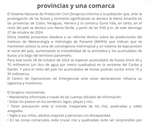 Panamá, 27 de octubre de 2024. El Sistema Nacional de Protección Civil (Sinaproc) informa a la población que, ante la prolongación de las lluvias y tormenta significativas se declara la Alerta Amarilla en las provincias de Colón, Veraguas,…