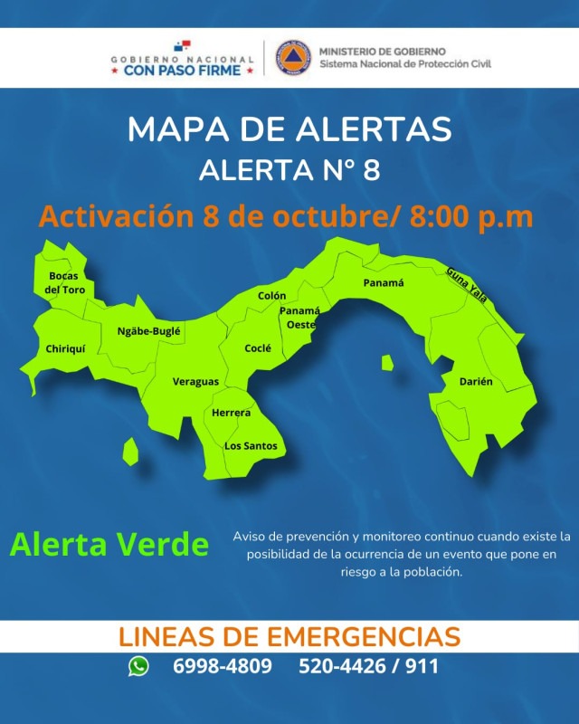 Panamá, 8 de octubre de 2024. El Sistema Nacional de Protección Civil (Sinaproc) emite una declaratoria de Alerta Verde en