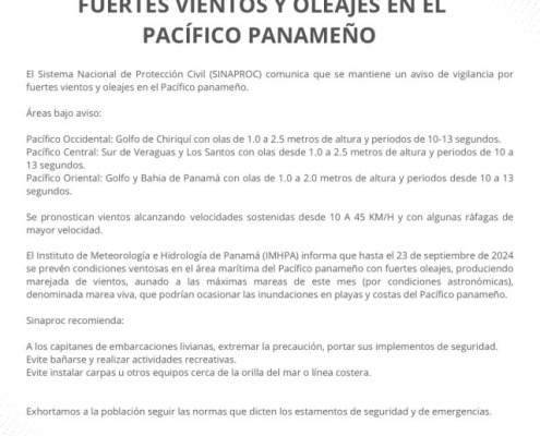 Panamá, 22 de septiembre de 2024. El Sistema Nacional de Protección Civil (SINAPROC) comunica que se mantiene un aviso de vigilancia por fuertes vientos y oleajes en el Pacífico panameño.
