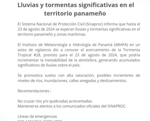 Panamá, 21 de agosto del 2024.- El Sistema Nacional de Protección Civil (Sinaproc) informa que hasta el 23 de agosto de 2024 se esperan lluvias y tormentas significativas en el territorio panameño y zonas marítimas.