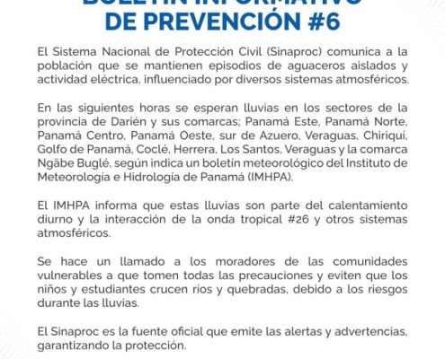 Panamá 19 de agosto de 2024.- El Sistema Nacional de Protección Civil (Sinaproc) comunica que se mantiene un aviso de prevención por mareas máximas en el Pacífico panameño a partir del 20 al 25 de agosto del 2024.