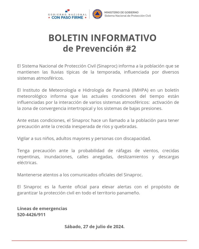 Panamá, 27 de julio del 2024. El Sistema Nacional de Protección Civil (Sinaproc) informa a la población que se mantienen