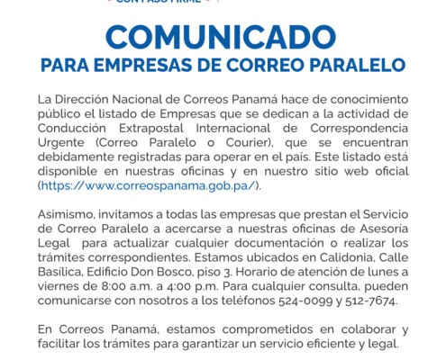 La Dirección Nacional de Correos Panamá hace de conocimiento público el listado de Empresas que se dedican a la actividad de Conducción Extrapostal Internacional de Correspondencia Urgente (Correo Paralelo o Courier), que se encuentran…