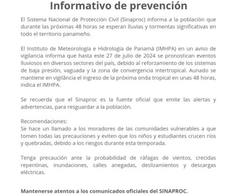Panamá 25 de julio del 2024. El Sistema Nacional de Protección Civil (Sinaproc) informa a la población que durante las próximas 48 horas se esperan lluvias y tormentas significativas en todo el territorio panameño.