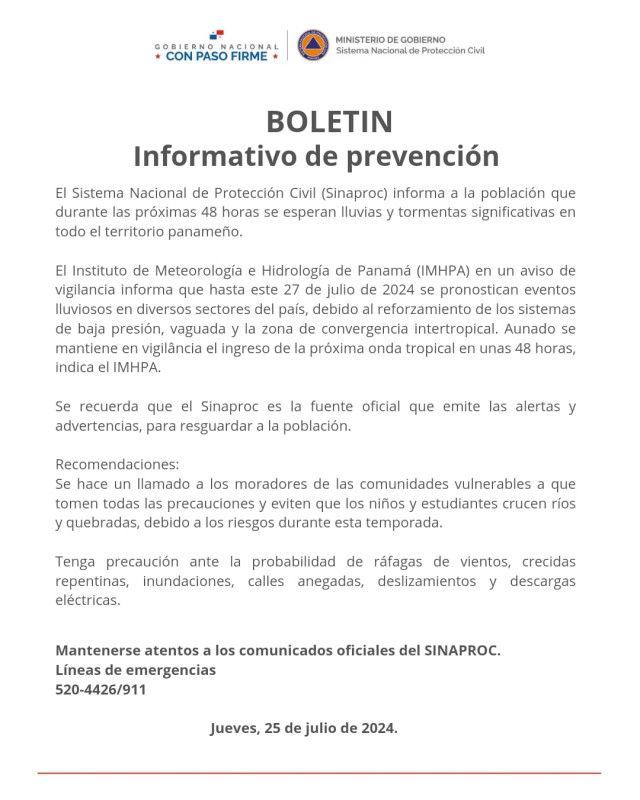 Panamá 25 de julio del 2024. El Sistema Nacional de Protección Civil (Sinaproc) informa a la población que durante las