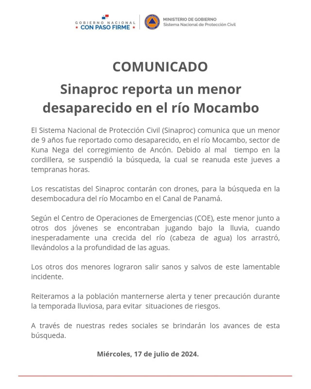 Panamá, 17 de julio de 2024. El Sistema Nacional de Protección Civil (SINAPROC) comunica que un menor de 9 años