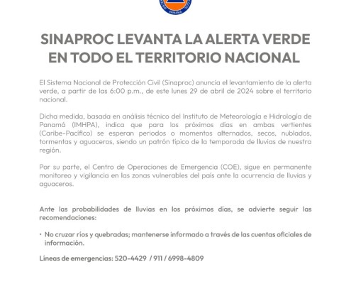 Panamá, 29 de abril de 2024. El Sistema Nacional de Protección Civil (Sinaproc) anuncia el levantamiento de la alerta verde, a partir de las 6:00 p.m., de este lunes 29 de abril de 2024 sobre el territorio nacional.