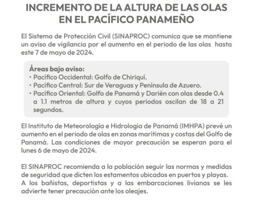 Panamá, 06 de mayo de 2024. El Sistema de Protección Civil (SINAPROC) comunica que se mantiene un aviso de vigilancia por el aumento en el periodo de las olas hasta este 07 de mayo de 2024.