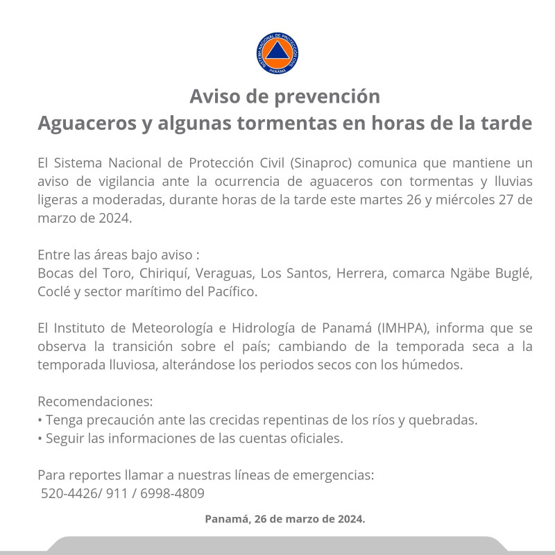 Panamá, 29 de marzo de 2024. El Sistema Nacional de Protección Civil (Sinaproc) informa que mantiene un aviso de prevención por