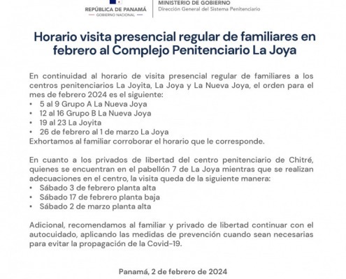 En continuidad al horario de visita presencial regular de familiares a los centros penitenciarios La Joyita, La Joya y La Nueva Joya, el orden para el mes de febrero 2024 es el siguiente: