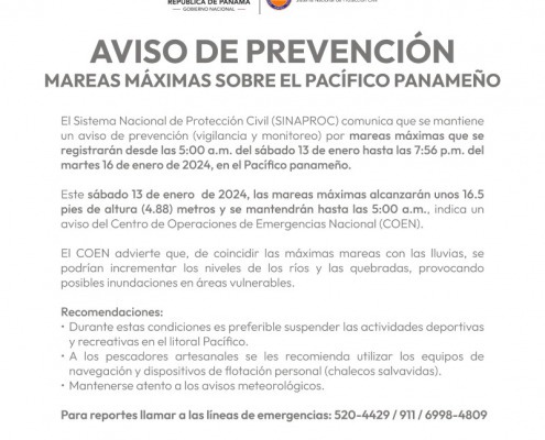Panamá, 12 de enero de 2024.- El Sistema Nacional de Protección Civil (SINAPROC) comunica que se mantiene un aviso de prevención (vigilancia y monitoreo) por mareas máximas que se registrarán desde las 5:00 a.m. del sábado 13 de enero…