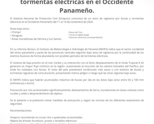 El Sistema Nacional de Protección Civil (Sinaproc) comunica de un aviso de vigilancia por lluvias y tormentas eléctricas en el Occidente Panameño del 11 al 14 de noviembre de 2024.