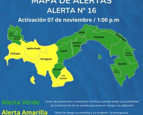 Panamá 7 de noviembre de 2024. El Sistema Nacional de Protección Civil (Sinaproc), comunica que ante los avisos meteorológicos y las mejoras en las condiciones del tiempo se disminuye la alerta roja en las provincias de Chiriquí, Veraguas,…